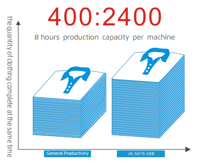 So với phương pháp thủ công truyền thống, JACK JK-T5878-58G tăng đáng kể năng suất sản xuất lên đến 500%. Sự gia tăng đáng kể về năng suất này cho phép các doanh nghiệp đáp ứng nhu cầu ngày càng tăng một cách dễ dàng.