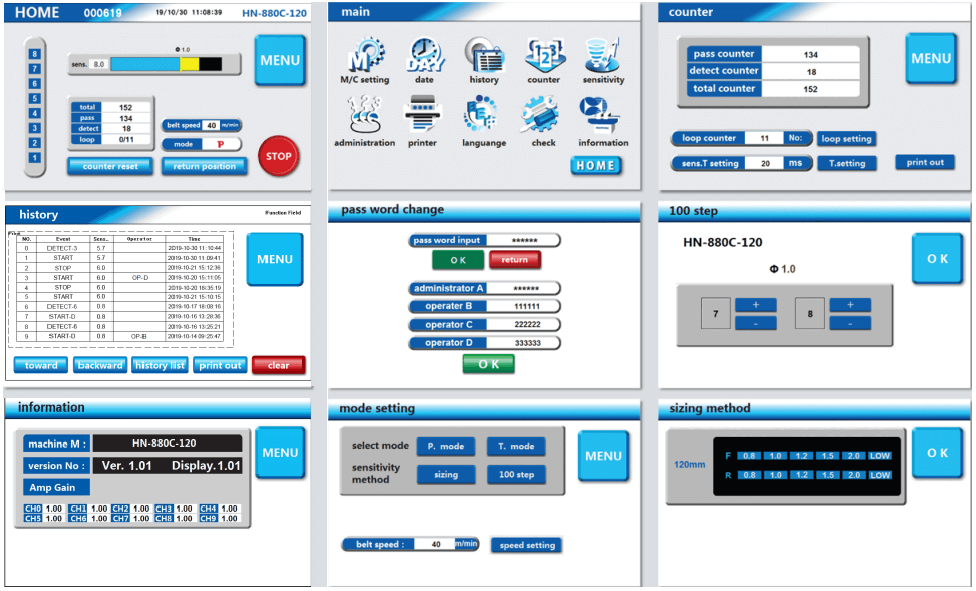 Máy dò kim Hashima HN-1380C trang bị một màn hình HMI LCD màu lớn 7-inch. Màn hình này có khả năng hiển thị tốt và thao tác dễ dàng. Ngoài các cài đặt nhạy cảm thông thường, bạn cũng có thể thiết lập mật khẩu quản trị và xuất lịch sử thông qua cổng USB.
