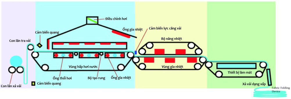 Để quá trình xử lý vải được tối ưu, đạt hiệu quả & chất lượng cao nhất, HSM-1800 có cấu trúc Module gồm 4 vùng chính sau: Vùng xả vải, vùng hấp/ủ hơi nước, vùng gia nhiệt & thiết bị làm mát